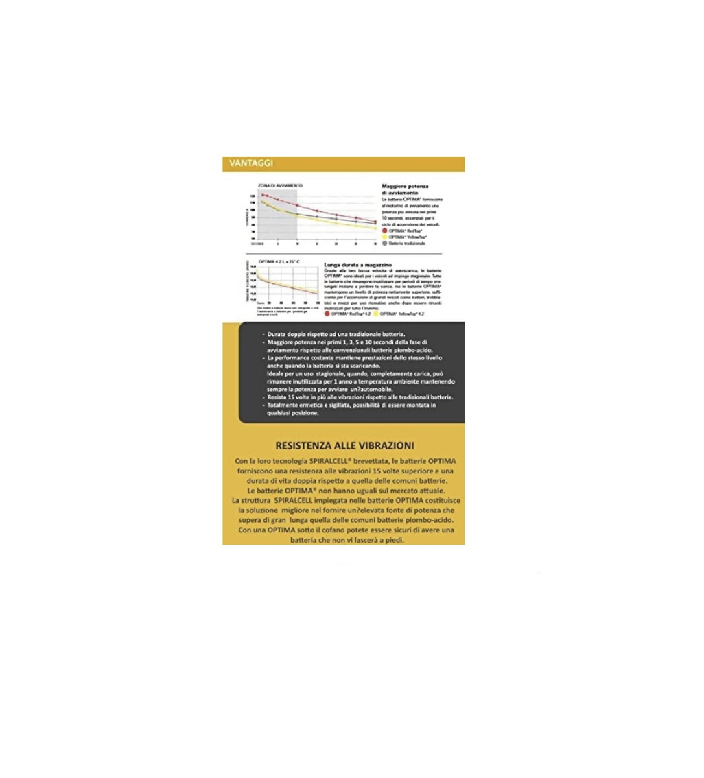 L'Optima è caratterizzata da una resistenza alle vibrazioni particolarmente elevata, ottenuta grazie alle solide connessioni delle celle fuse e alla distribuzione uniforme ed elevata della pressione su tutta la banda della griglia. Le batterie Optima Red Top sono appositamente progettate per carichi estremi. Grazie alla Spiralcell Technology brevettata, la batteria offre una resistenza alle vibrazioni 15 volte superiore e una durata doppia rispetto alle batterie tradizionali.